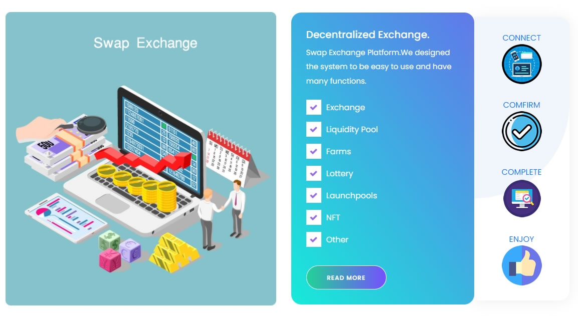 Gmining (GMNTCoin) we are a decentralized exchange platform for exchanging BEP-20 tokens on the most stable Binance Smart Chain network. This network guarantees superior speed and lower transaction costs on the network. Decentralized financing through products and services is fast, secure, and tokens can be swapped by anyone. and can connect to multiple wallets